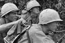 | Staff. Sgt. Joe Musial (left) hears on the radio that the rest of his company is pinned down by withering fire from North Vietnamese Soldiers (NVA) on the Bong Son plain of Vietnam's central lowlands onf Feb. 14, 1967. Musial, known to all as Sgt. Rock, was part of D Co., 1st Battalion, 8thCavalry Regiment, 1st Cavalry Division.