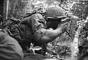 | A young soldier takes cover during a 1967 firefight in Vietnam's central highlands.