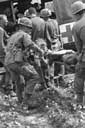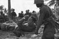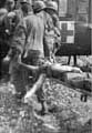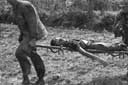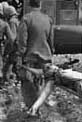 | C Co., 1st Battalion, 8th Cavalry Regiment, 1st Cavalry Division, approached the village of Lieu An on the Bong Son plain during Operation Pershing. The night before they had been in a firefight at the village. As they approached in the morning they tripped mines. Three soldiers were wounded and one was killed. Here the dead soldier is being loaded into Huey helicopter Medevac. |