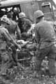 | C Co., 1st Battalion, 8th Cavalary Regiment, 1st Cavalry Division, approached a village on the Bong Son plain during Operation Pershing. The night before they had been in a firefight at the village. As they approached in the morning they tripped mines. Three soldiers were wounded and one was killed. Here one of the wounded is being loaded into a UH-1 Huey helicopter Medevac. |