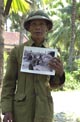 | Nguyen Van Sic, born in 1939, holds a picture of his mother (foreground) as she tried vainly to douse flames burning their house. Sic says that days after troops from the U.S. 1st Cavalry Division during Operation Pershing burned his home in the village of Lieu An on the Bong Son Plain of Vietnam he joined the Viet Cong. Here he's seen in his old uniform. |