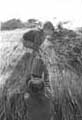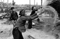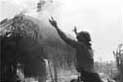 | Nguyen Xuan Me on the burning thatch roof of a house is handed a bucket of water by an old woman. The house had been set afire by troopers from C Co., 1st Battalion, 8th Cavalry Regiment, 1st Cavalry Division. The soldiers set fire to the village of Lieu An on the Bong Son plain during Operation Pershing. The night before the soldiers had been in a firefight at the village. As the soldiers approached in the morning they tripped mines. Three soldiers were wounded and one was killed. |