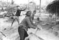 | Two Vietnamese women and Nguyen Xuan Me throw dirt on a house that had been set afire by troopers from C Co., 1st Battalion, 8th Cavalry Regiment, 1st Cavalry Division. The soldiers set fire to their homes in the village of Lieu An on the Bong Son plain during Operation Pershing. The night before the soldiers had been in a fire fight at the village. As the soldiers approached in the morning they tripped mines. Three soldiers were wounded and one was killed. |
