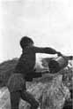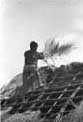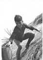 | Nguyen Xuan Me on the burning thatch roof of a house that had been set afire by troopers from C Co., 1st Battalion, 8th Cavalry Regiment, 1st Cavalry Division. The soldiers set fire to the village of Lieu An on the Bong Son plain during Operation Pershing. The night before they had been in a firefight at the village. As the soldiers approached in the morning they tripped mines. Three soldiers were wounded and one was killed. |