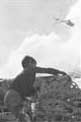 | As a light observation helicopter passes overhead, a Vietnamese boy tries vainly to put out the burning thatch roof of a house that had been set afire by troopers from C Co., 1st Battalion, 8th Cavalry Regiment, 1st Cavalry Division. The soldiers set fire to the village of Lieu An on the Bong Son plain during Operation Pershing. The night before they had been in a firefight at the village. As the soldiers approached in the morning they tripped mines. Three soldiers were wounded and one was killed. |