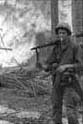 | A trooper with an M-60 machine gun on his shoulder stands in front of a burning village. Soldiers from C Co., 1st Battalion, 8th Cavalry Regiment, 1st Cavalry Division, set fire to the village of Lieu An on the Bong Son plain during Operation Pershing. The night before they had been in a firefight at the village. As the soldiers approached in the morning they tripped mines. Three soldiers were wounded and one was killed. |