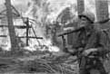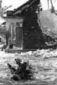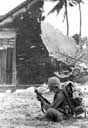 | A trooper with an M-79 grenade launcher sit in front of a ruined house in a burned out village. The soldiers from C Co., 1st Battalion, 8th Cavalry Regiment, 1st Cavalry Division set fire to the village of Lieu An on the Bong Son plain during Operation Pershing. The night before the soldiers had been in a firefight at the village. As the soldiers approached in the morning they tripped mines. Three soldiers were wounded and one was killed.