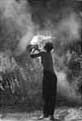 | A Vietnamese woman throws water on a house that had been set afire by troopers from C Co., 1st Battalion, 8th Cavalry Regiment, 1st Cavalry Division. The soldiers set fire to the village of Lieu An on the Bong Son plain during Operation Pershing. The night before the soldiers had been in a firefight at the village. As the soldiers approached in the morning they tripped mines. Three soldiers were wounded and one was killed.