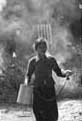 | A Vietnamese woman with a water bucket walks away from a house that had been set afire by troopers from C Co., 1st Battalion, 8th Cavalry Regiment, 1st Cavalry Division. The soldiers set fire to the village of Lieu An on the Bong Son plain during Operation Pershing. The night before the soldiers had been in a firefight at the village. As the soldiers approached in the morning they tripped mines. Three soldiers were wounded and one was killed.