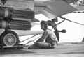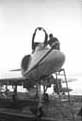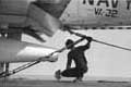 A crewman does a preflight check on an A-4 attack jet on the aircraft carrier USS Coral Sea in the South China Sea in 1966. The jet belonged to squadron VA-22.