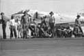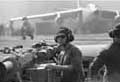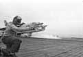 The flight crew of the aircraft carrier USS Coral Sea during launch operations in the South China Sea in 1966. An A-3 bomber/tanker is in the background.