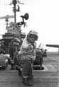 A flight deck crewman gives the launch sign to an F-8 Crusader on the aircraft carrier USS Coral Sea in the South China Sea in 1966.
