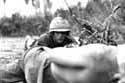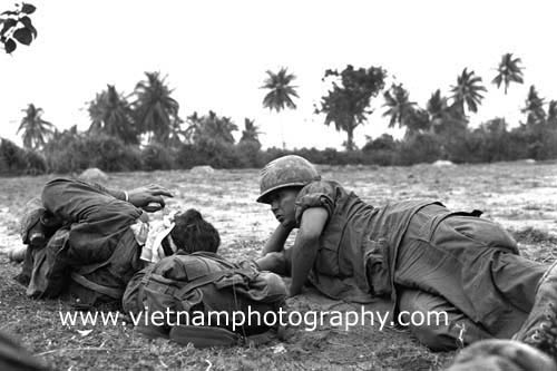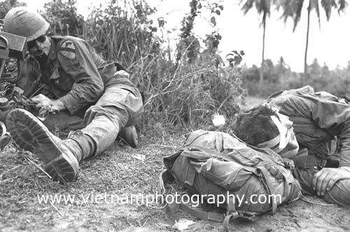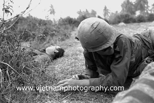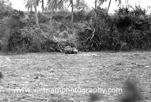 | An older sergeant, fatigued from a run across open field, ignored advice to stay down because of snipers and was shot in head. Here he lies on a paddy dike moments after he was hit. |