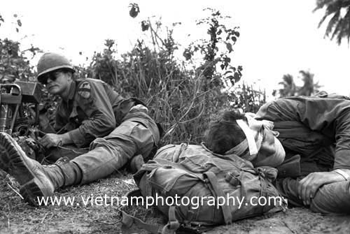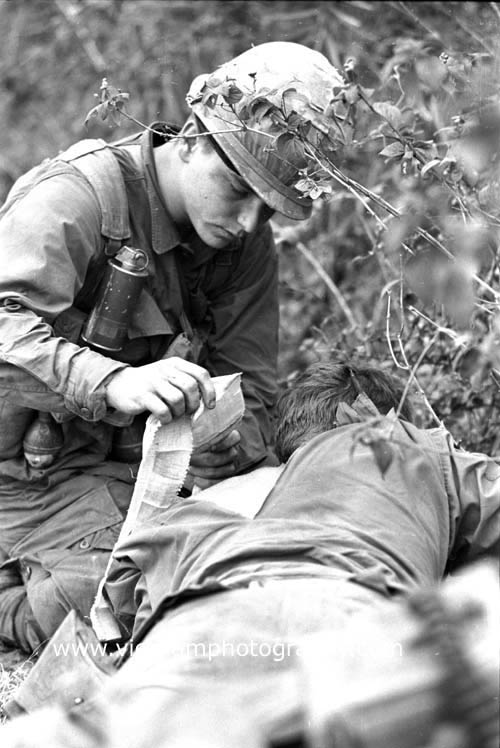 | A wounded trooper from the 1st Cavalary Division being treated by medic in the central lowlands of Vietnam. |
