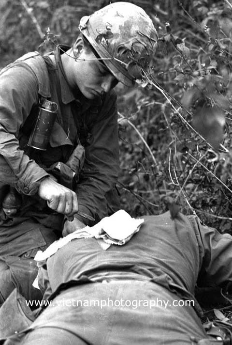 | A medic treats a soldier from the 1st Cavalry Division who was wounded during a firefight in the central lowlands of Vietnam. |