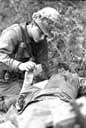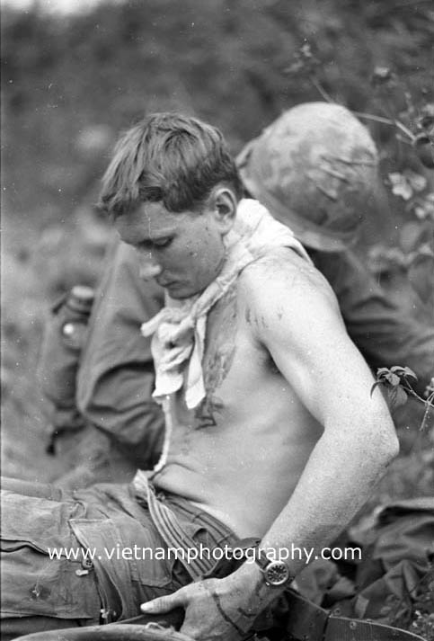 | An older sergeant in the 1st Cavalary Division, fatigued from a run across open field, ignored advice to stay down because of snipers and was shot in head. After being patched up, he awaits a Medevac. An officer is on the radio calling for the helicopter. The action took place in the central lowlands of Vietnam. |