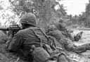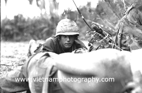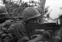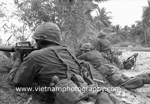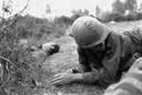 | Troopers from the 1st Cavalry Division take cover behind a rice paddy dike and return fire during a battle in the central lowlands of Vietnam. |