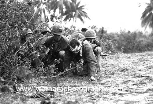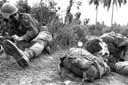 | Soldiers from the 1st Cavalry Division crawl to safety with wounded troopers whhile under sniper fire in Vietnam's central lowlands. |
