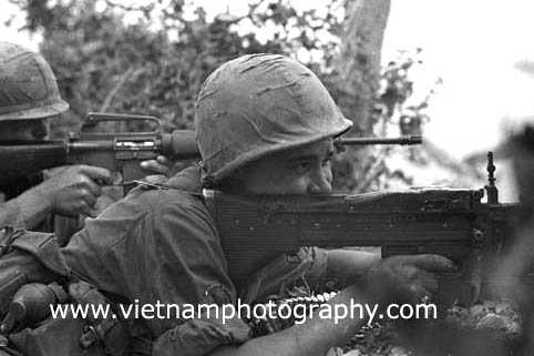 | A look of intensity on the face of a soldier from the 1st Cavalary division as he fires his M-60 machine gun during afirefight in the central lowlands of Vietnam. |