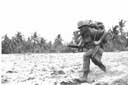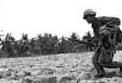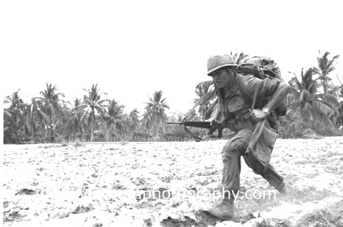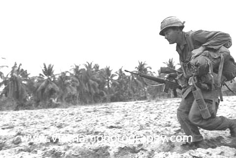 | A soldier from the 1st Cavalary Division runs for cover in a dried out rice paddy during a firefight in the central lowlands of Vietnam. |