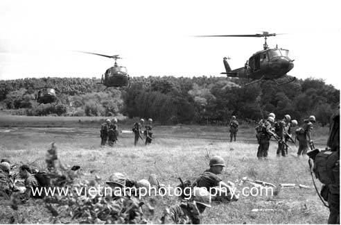 | Soldiers from the 1st Cavalry Divsion assemble in a Landing Zone (LZ) and prepare to board UH-1 Huey helicopters prior to an air assault. |