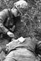 | An older sergeant, fatigued from a run across open field, ignored advice to stay down because of snipers and was shot in head. After being patched up, he awaits a Medevac. An officer is on the radio calling for the helicopter. |