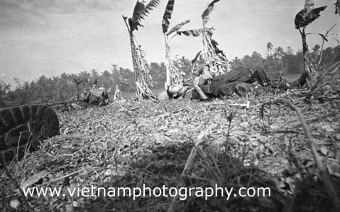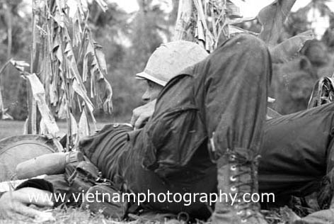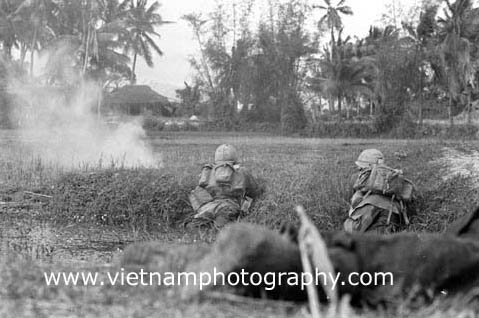 | Soldiers, pinned down by a North Vietnamese ambush, return fire. The fight took place on the Bong Son plain of Vietnam's central lowlands on Feb. 14, 1967. The soldiers were part of D Co., 1st Battalion, 8th Cavalry Regiment, 1st Cavalry Division.