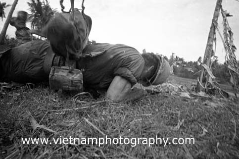 | Staff Sgt. Joe Musial crawls for cover in the opening shots of a North Vienamese Army (NVA) ambush on the Bong Son plain of Vietnam's central lowlands on Feb. 14, 1967. Musial, known to all as Sgt. Rock, was part of D Co., 1st Battalion, 8th Cavalry Regiment, 1st Cavalry Division.