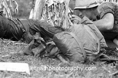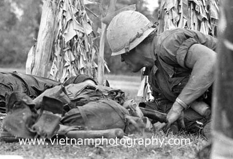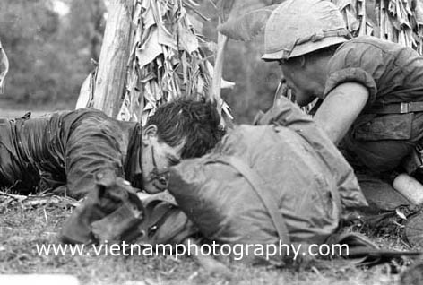| Under withering North Vietnamese Army (NVA) fire, Staff Sgt. Joe Musical cuts M-79 grenade ammunition off the body of a soldier killed in the opening salvo of an ambush.The fight took place on the Bong Son plain of Vietnam's central lowlands on Feb. 14, 1967. Musial, known to all as Sgt. Rock, was part of D Co., 1st Battalion, 8th Cavalry Regiment, 1st Cavalry Division.