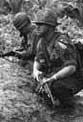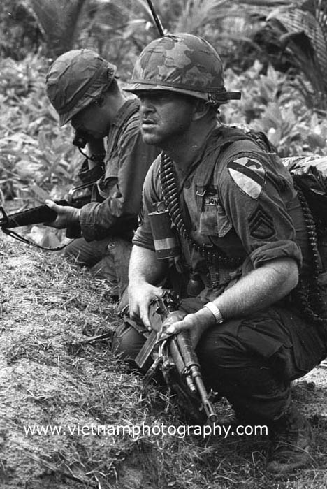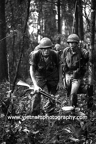 | A sergeant and his radio operator (RTO) pause on the side of Chu Pong Mountain in the Ia Drang Valley during the summer of 1966. They were with the 1st Cavalry Division.