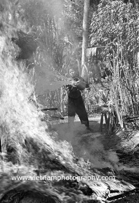 | A Vietnamese woman throws water on a house that had been set afire by troopers from C Co., 1st Battalion, 8th Cavalry Regiment, 1st Cavalry Division. The soldiers set fire to the village of Lieu An on the Bong Son plain during Operation Pershing. The night before the soldiers had been in a firefight at the village. As the soldiers approached in the morning they tripped mines. Three soldiers were wounded and one was killed.