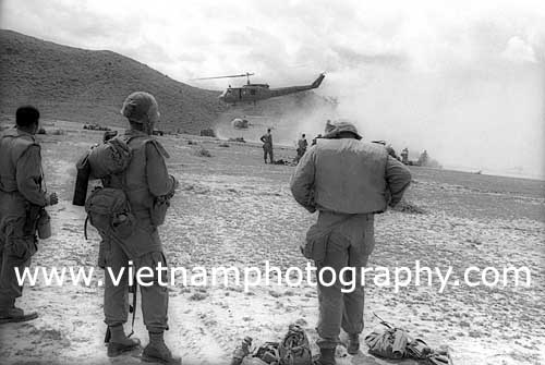 | Troopers from the 1st Cavalry Division wait in an LZ to board UH-1 Huey helicopters before an air assault in Vietnam's Central Highlands.