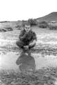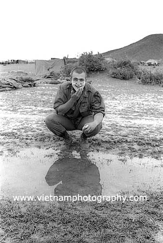 | A young officer uses a mud puddle as both sink and mirror as he shaves at the An Khe base camp of the 1st Cavalry Division.