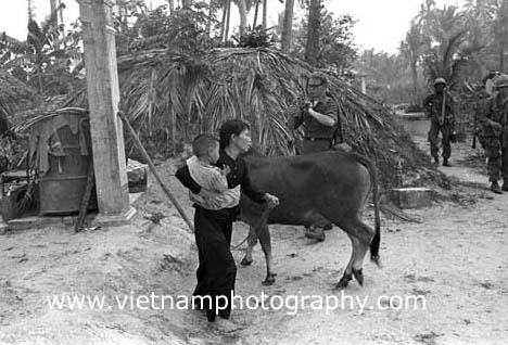 | Nguyen Thi Hoai, 26, holds her two-year-old daughter, Lam Thi Tho, while Nguyen Xuan Me stands by as troopers from C Co., 1st Battalion, 8th Cavalry Regiment, 1st Cavalry Division, set fire to their village, Lieu An, on the Bong Son plain during Operation Pershing. The night before the soldiers had been in a firefight at the village. As the soldiers approached in the morning they tripped mines. Three soldiers were wounded and one was killed. |