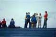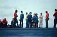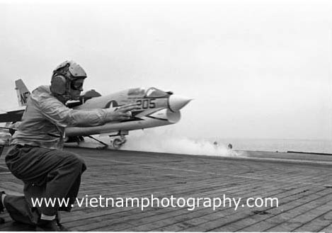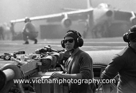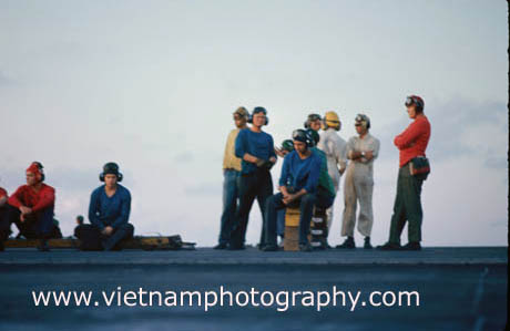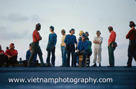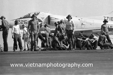 The flight crew of the aircraft carrier USS Coral Sea during launch operations in the South China Sea in 1966. An A-3 bomber/tanker is in the background.
