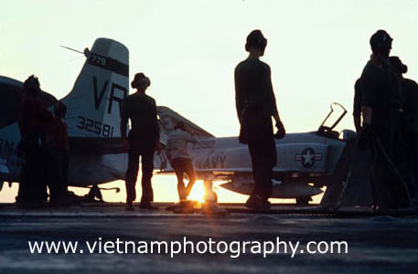 Aircraft carrier flight deck crews on the aircraft carrier USS Coral Sea prepare planes for attacks against North Vietnam from the South China Sea in 1966. An F-4 Phantom jet is in the background.