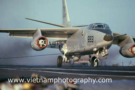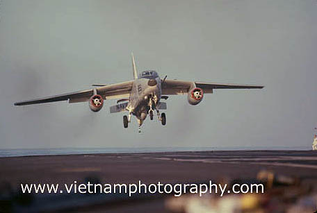 An A-3B lands on the aircraft carrier USS Coral Sea. This multi-purpose aircraft could be used as a bomber or a tanker. Here it is returning from a mission as an air-to-air refueling tanker.