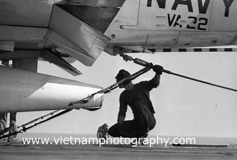 A crewman does a preflight check on an A-4 attack jet on the aircraft carrier USS Coral Sea in the South China Sea in 1966. The jet belonged to squadron VA-22.
