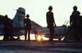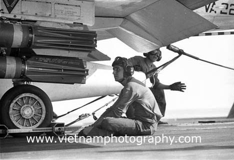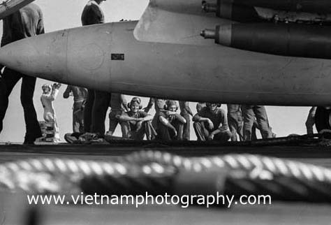 Aircraft carrier flight deck crews on the aircraft carrier USS Coral Sea prepare planes for attacks against North Vietnam from the South China Sea in 1966.