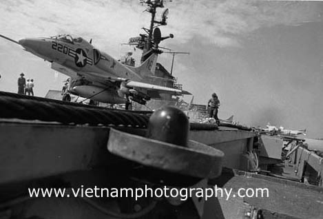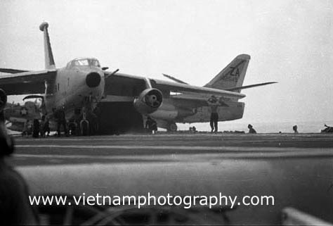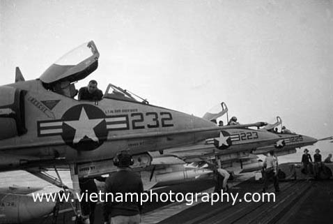 A-4 attack jets parked on the flight deck of the aircraft carrier USS Coral Sea in 1966. The plane in the foreground belonged to Lt. Junior grade Bob Dinwiddie, who apparently survived the war.