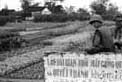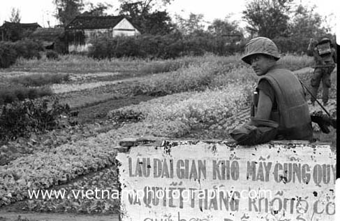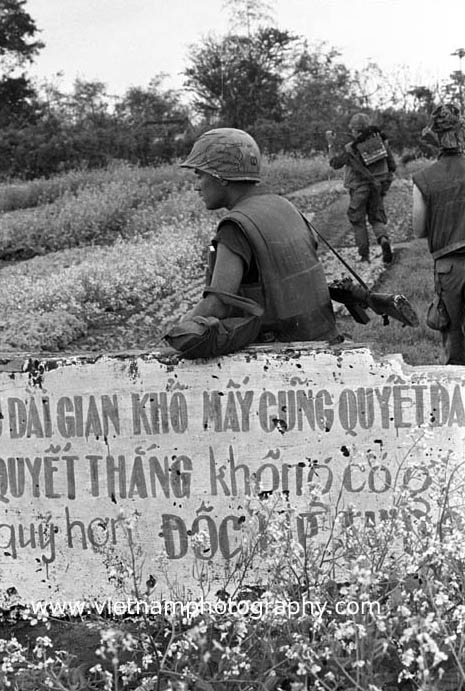 | A young Marine sits on a wall outside a village in I Corps in 1967. The writing on the wall is pro-Saigon propaganda slogans.