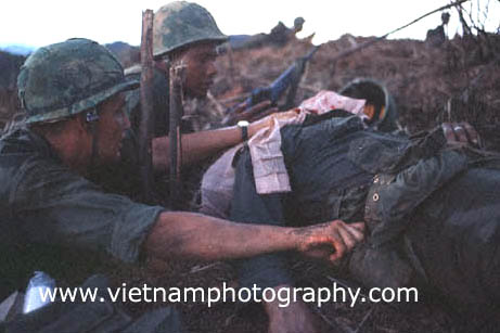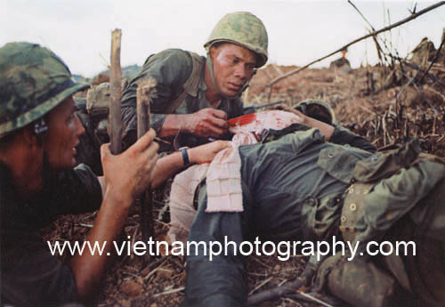 | Navy corpsman David Lewis Boucher, 22, Shelbyville, Tenn., (left) and Marine Staff Sgt. Ruben Santos treat Pvt. William Vizzerra, 21, Phoenix, Ariz., near the crest of Hill 881 N. The Hill was one of several strategically imporant hills surrounding Khe Sahn in western Quang Tri Province in Vietnam's I Corps. The fighting between the Marines and North Vietnamese Army (NVA) regulars took place on April 30, 1967.