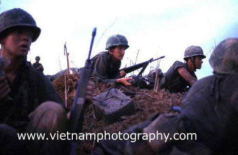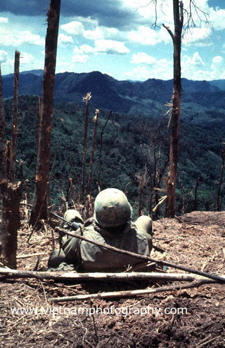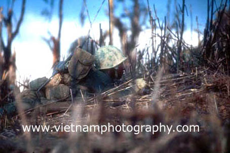 | A Marine pinned down by fire from North Vietnamese troops hidden in spider holes on Hill 881 N. The Hill was one of several strategically imporant hills surrounding Khe Sahn in western Quang Tri Province in Vietnam's I Corps. The fighting between the Marines and North Vietnamese Army (NVA) regulars took place on April 30, 1967. The Marines were from Golf Co., 2nd Battalion, 3rd Marine Regiment, 3rd Marine Division.