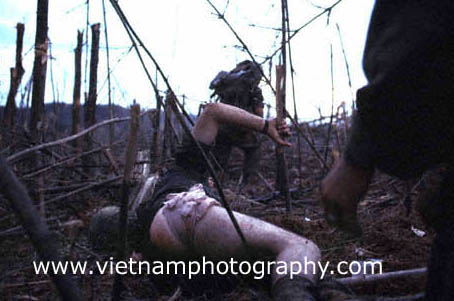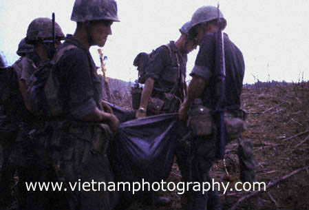 | Marines use a pancho to carry the body of a Marine killed in fierce fighting atop Hill 881 N. The Hill was one of several strategically imporant hills surrounding Khe Sahn in western Quang Tri Province in Vietnam's I Corps. The fighting between the Marines and North Vietnamese Army (NVA) regulars took place on April 30, 1967. The Marines were from Golf Co., 2nd Battalion, 3rd Marine Regiment, 3rd Marine Division.