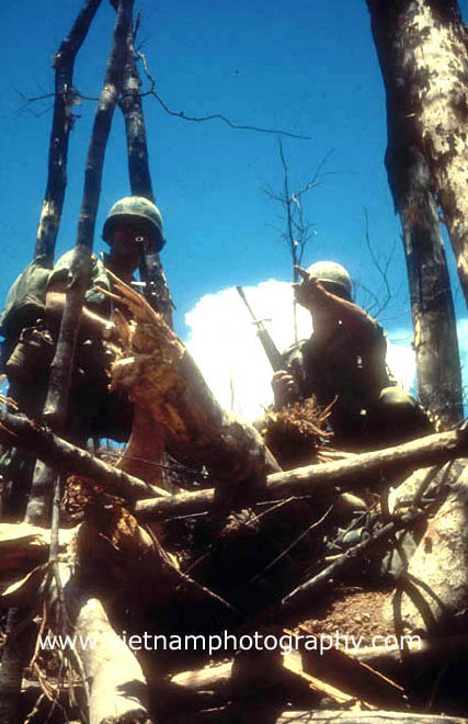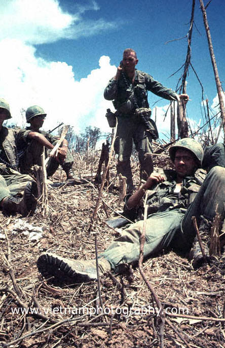 | By sundown, the worst of the fighting was over as Marines caught their breath atop Hill 881 N. The Hill was one of several strategically imporant hills surrounding Khe Sahn in western Quang Tri Province in Vietnam's I Corps. The fighting between the Marines and North Vietnamese Army (NVA) regulars took place on April 30, 1967. The Marines were from Golf Co., 2nd Battalion, 3rd Marine Regiment, 3rd Marine Division.