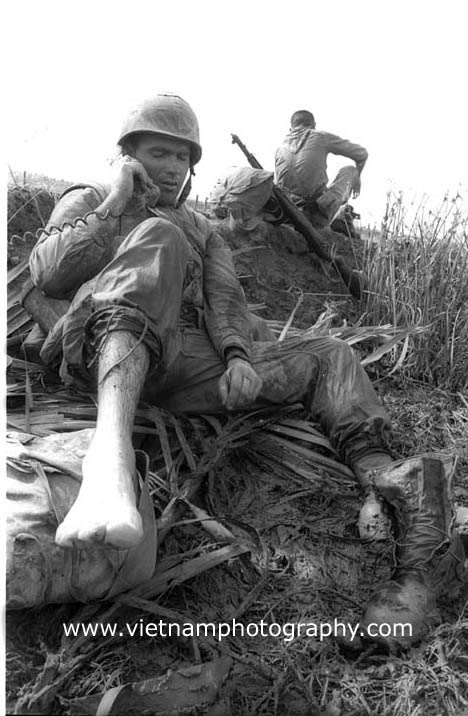 | Marine Robert Aaron (rank unknown), Philadelphia, talks on the radio while drying his feet after slogging through the swamp Mekong Delta. He was from Alpha Co., 1st Battalion, 9th Regiment, 3rd Marine Division. They were taking part in Operation Deckhouse V in the Mekong Delta in January 1967.