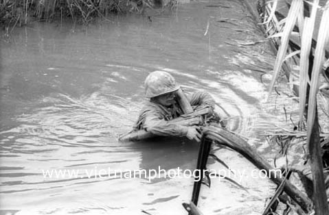| A Marine with an armfull of LAWs (light anti-tank weapons) wades across a canal in the Mekong Delta. The Marines were from Alpha Co., 1st Battalion, 9th Regiment, 3rd Marine Division. They were taking part in Operation Deckhouse V in the Mekong Delta in January 1967.