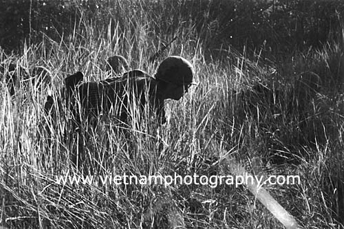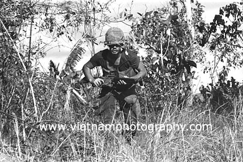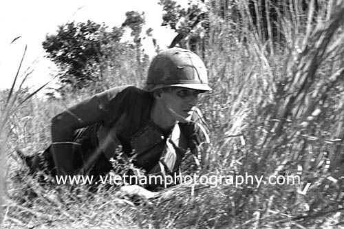 | Pfc. William R. Kryscnski, 20, of Keansburg, N.J., from Bravo Co., 4th Battalion, 31st Infantry Regiment, 196th Light Infantry Brigade, Americal Division, and other soldiers scramble for cover during a firefight in the Hiep Duc Valley, 35 miles south of Danang. The valley was the site of some of the fiercest fighting of the war between Americans and North Vietnamese Army (NVA) regulars.