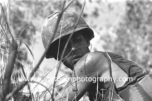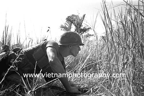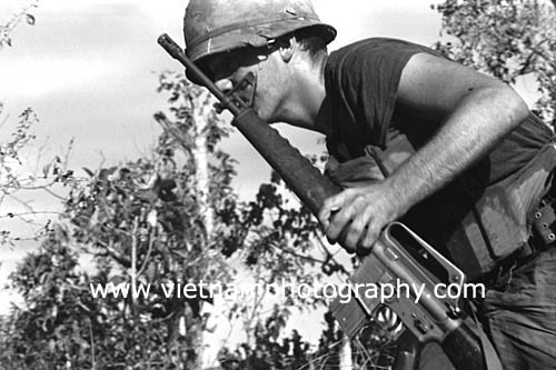 | Spc. 4 Jackie Roush, 22, of Mississippi, from Bravo Co., 4th Battalion, 31st Infantry Regiment, 196th Light Infantry Brigade, Americal Division, looks for the enemy during a firefight in the Hiep Duc Valley, 35 miles south of Danang. The valley was the site of some of the fiercest fighting of the war between Americans and North Vietnamese Army (NVA) regulars.