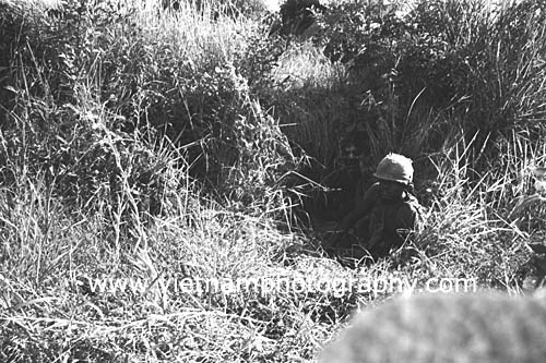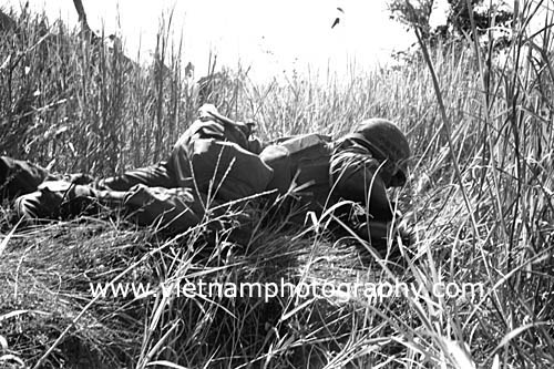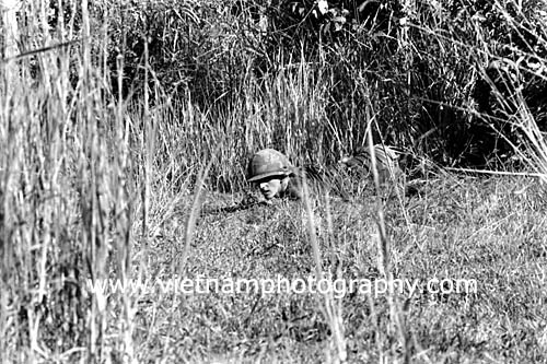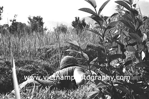 | A soldiers from Bravo Co., 4th Battalion, 31st Infantry Regiment, 196th Light Infantry Brigade, Americal Division, pinned down during a firefight in the Hiep Duc Valley, 35 miles south of Danang. The valley was the site of some of the fiercest fighting of the war between Americans and North Vietnamese Army (NVA) regulars.
